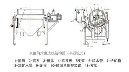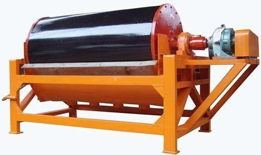 CTS、CTN、CTB系列永磁筒式磁選機磁場分旋轉式、固定式兩種機構,固定式主要適用于弱磁場濕式選別細顆粒的強磁性物質,或者除去非磁性礦物中的強磁性礦物,當漿流入磁場區時,其中強磁性礦物被吸附在圓筒表面,弱磁性和非磁性礦物被分選后排除,而吸附在圓筒表面的強磁性礦物隨圓筒的旋轉被帶出磁場區。旋轉式適用于細粒強(中強)磁性礦物的干選,由于高速旋轉的作用,使磁性顆粒的磁滾翻次數大大高于普通磁選機,這對于破環磁團聚,提高富礦比具有顯著的效果,礦物經分選后被分離成磁性物和非磁性物兩種,分別從各自的排礦口排出該機,適用于礦石粒度為0.6-6mm的粗選和精選。